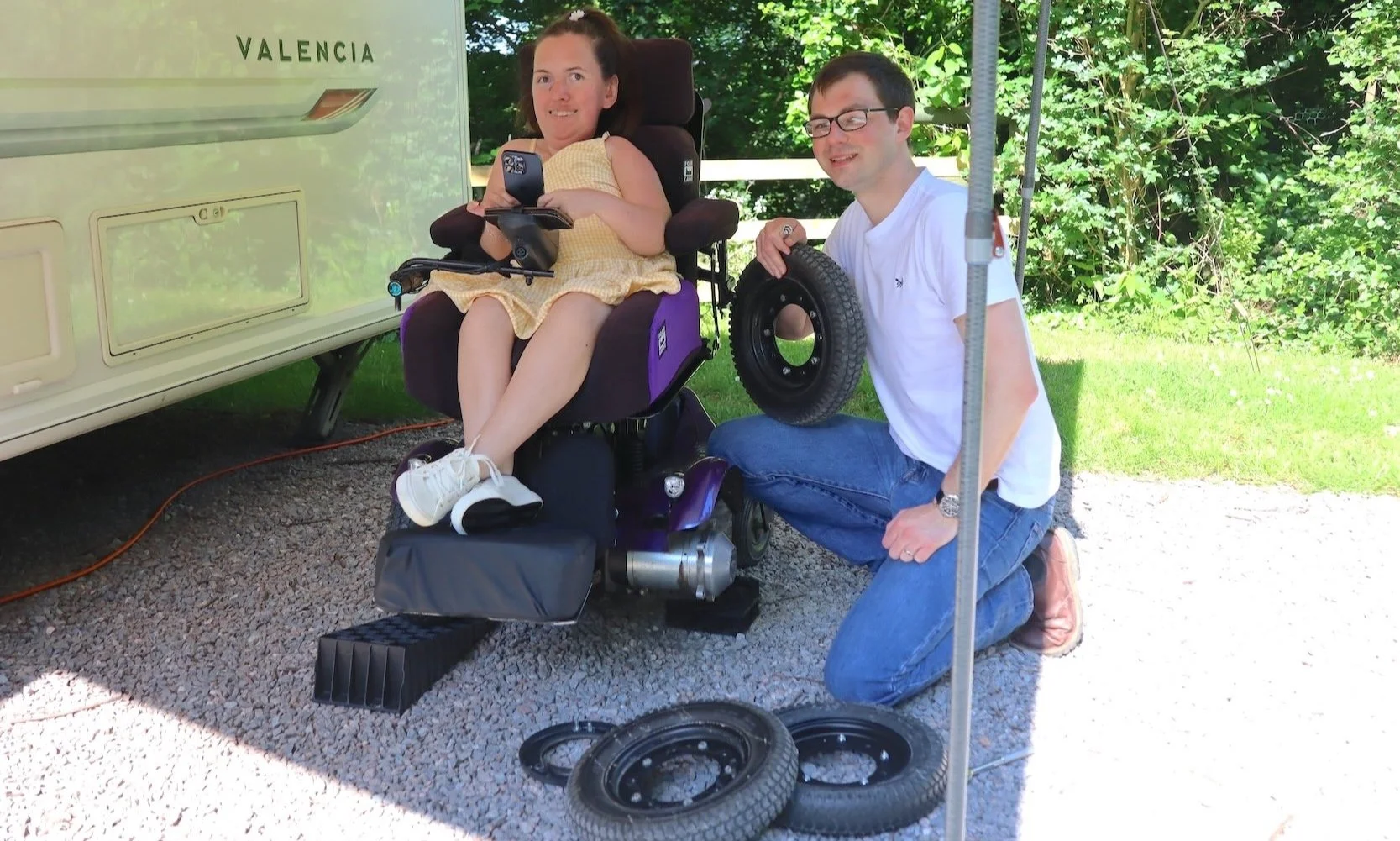 As well as experiencing a marginal change in comfort, I was surprised to discover that it also affected the functionality of my powerchair. I had noticeably more grip. Granted, I put my chair through its paces during our adventures, but some things my solid tyres would scramble for grip on, my pneumatic tyres navigated with ease. Be it a steep slope or small step. One example of this is the almost 2inch high, round-edged stone threshold of our front door. My solid tyres usually slip slightly before making it over, while the inflated ones didn’t bat an eye at it. Another example came when changing back to solids after using the inflated ones for a year. We changed them on a gravel campsite pitch during a trip, and the difference was obvious. The gravel that I glided over easily with inflated tyres was now churning up under the solid ones. I could still manage to manoeuvre, but it was noticeably harder to avoid my wheels digging themselves in.