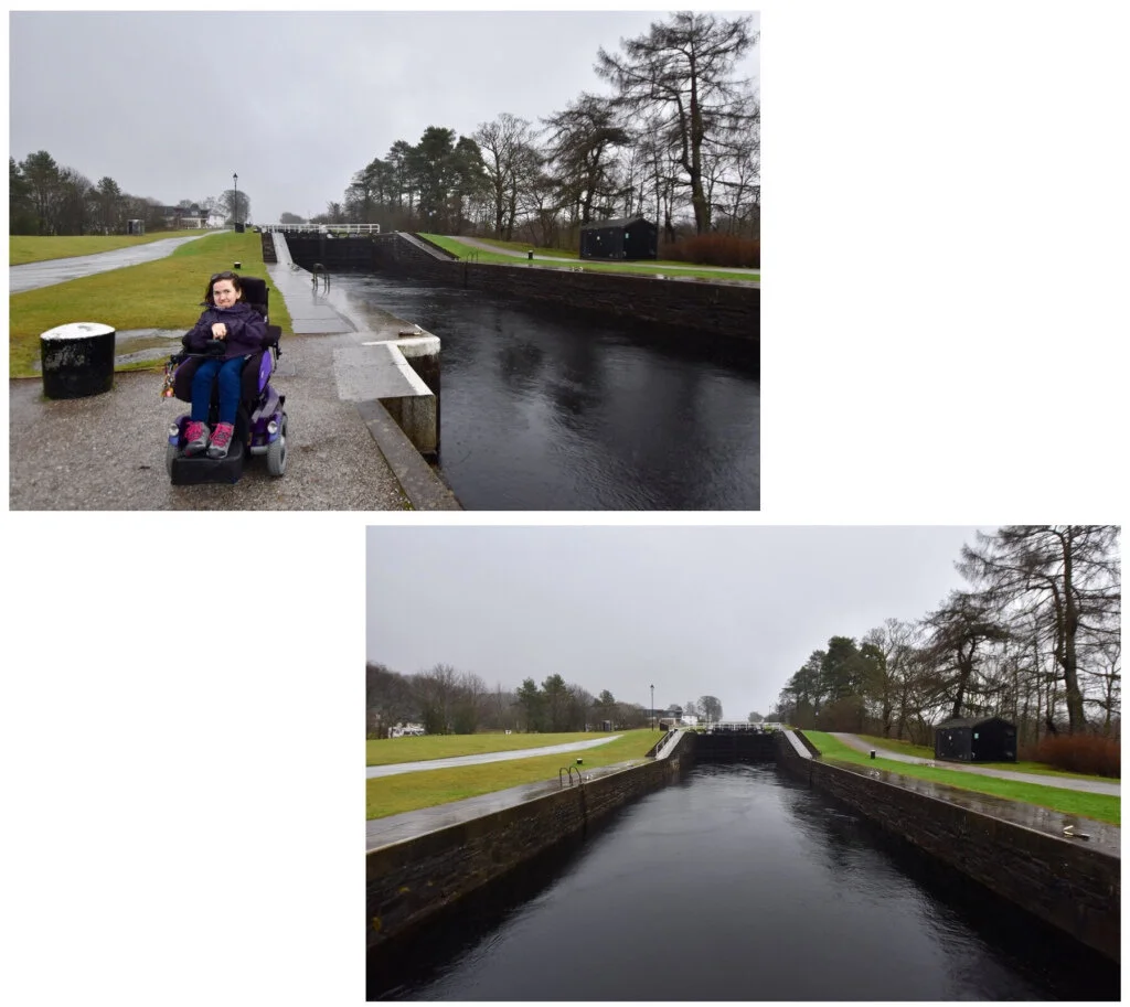 It didn’t look like the rain was going anywhere anytime soon, but we optimistically headed out to Scotland’s longest staircase lock- Neptune’s Staircase. Forming part of the Caledonian Canal, it assists a huge variety of boats back and forth, and being over a quarter of a mile of locks, it takes about 90 minutes to do so! Running alongside it is an accessible section of path that makes up a small part of the 79 mile long Great Glen Way. Had the weather been a little less dramatic we would’ve loved to have gone for a stroll, but by now we were getting pelted sideways by this invisible rain!